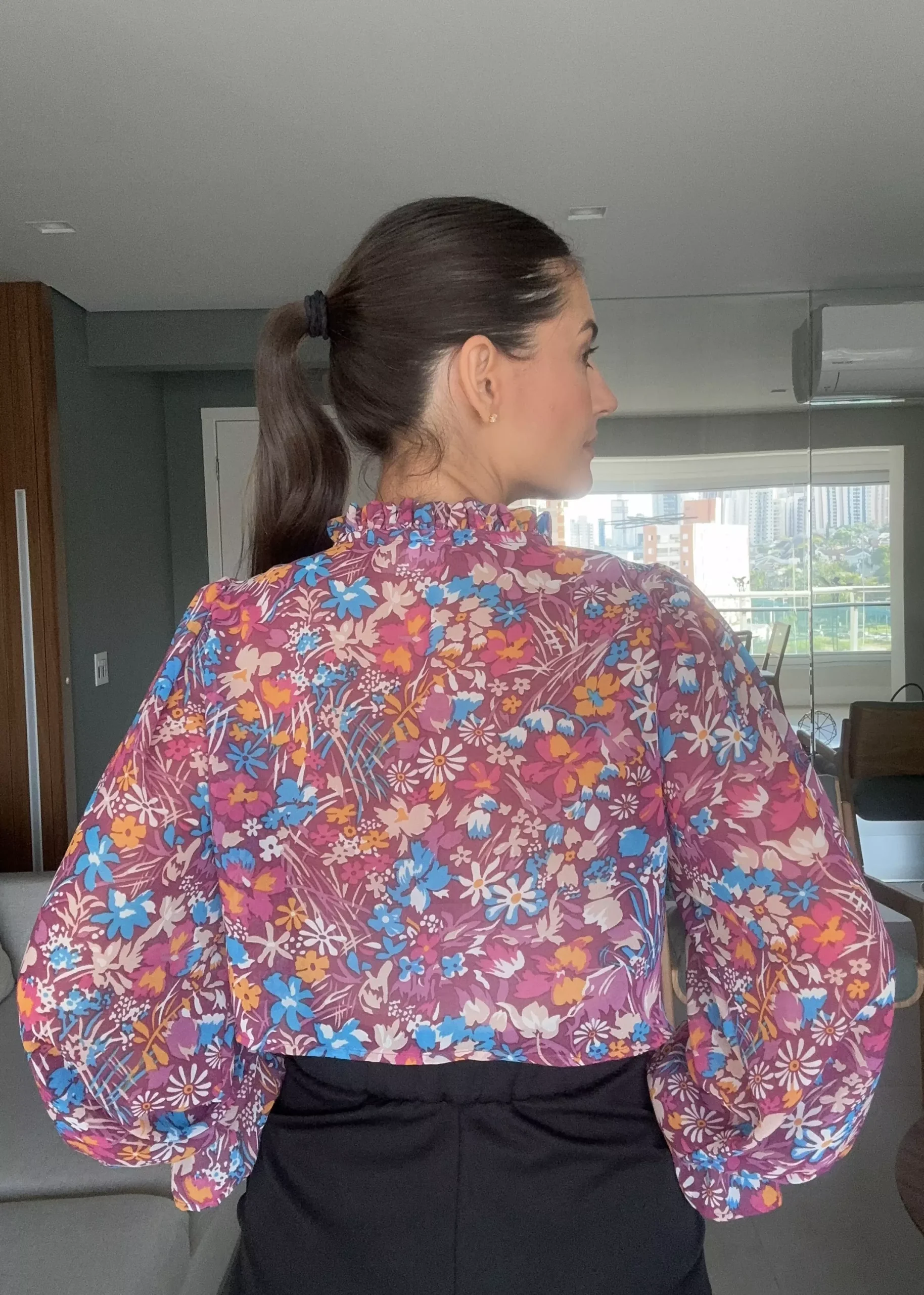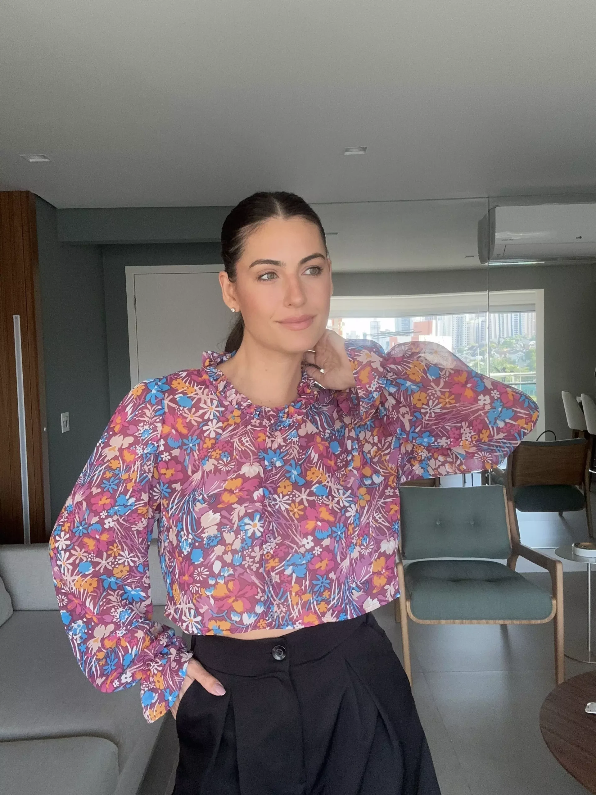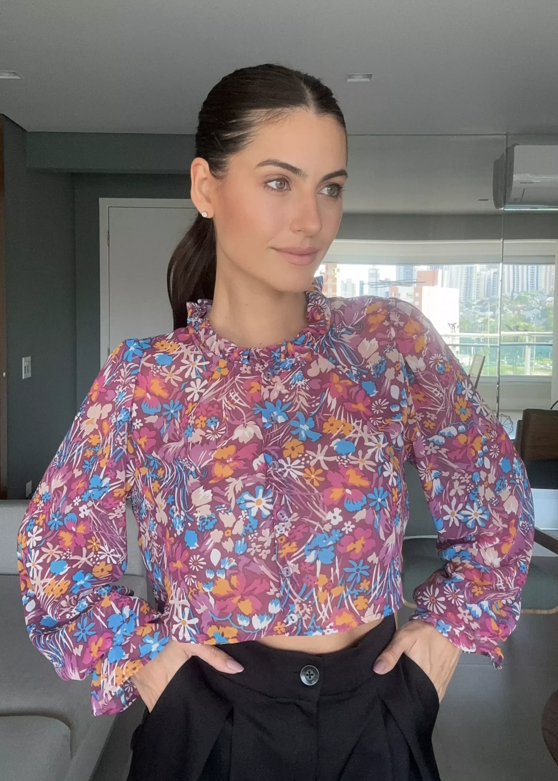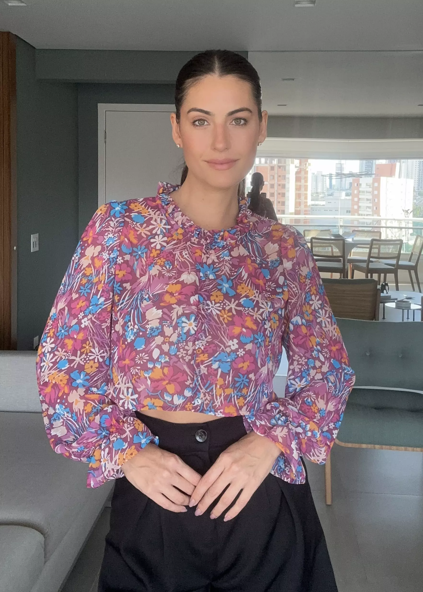 CAMISA PALERMO CROPPED é confeccionada com tecido Musseline, de caimento leve e fluido e que não amassa com facilidade. Com elástico nos punhos e babado. Tem fechamento frontal de botões transparentes e uma gola babadinho. Drapeado nos ombros. Peça fluida e super feminina.