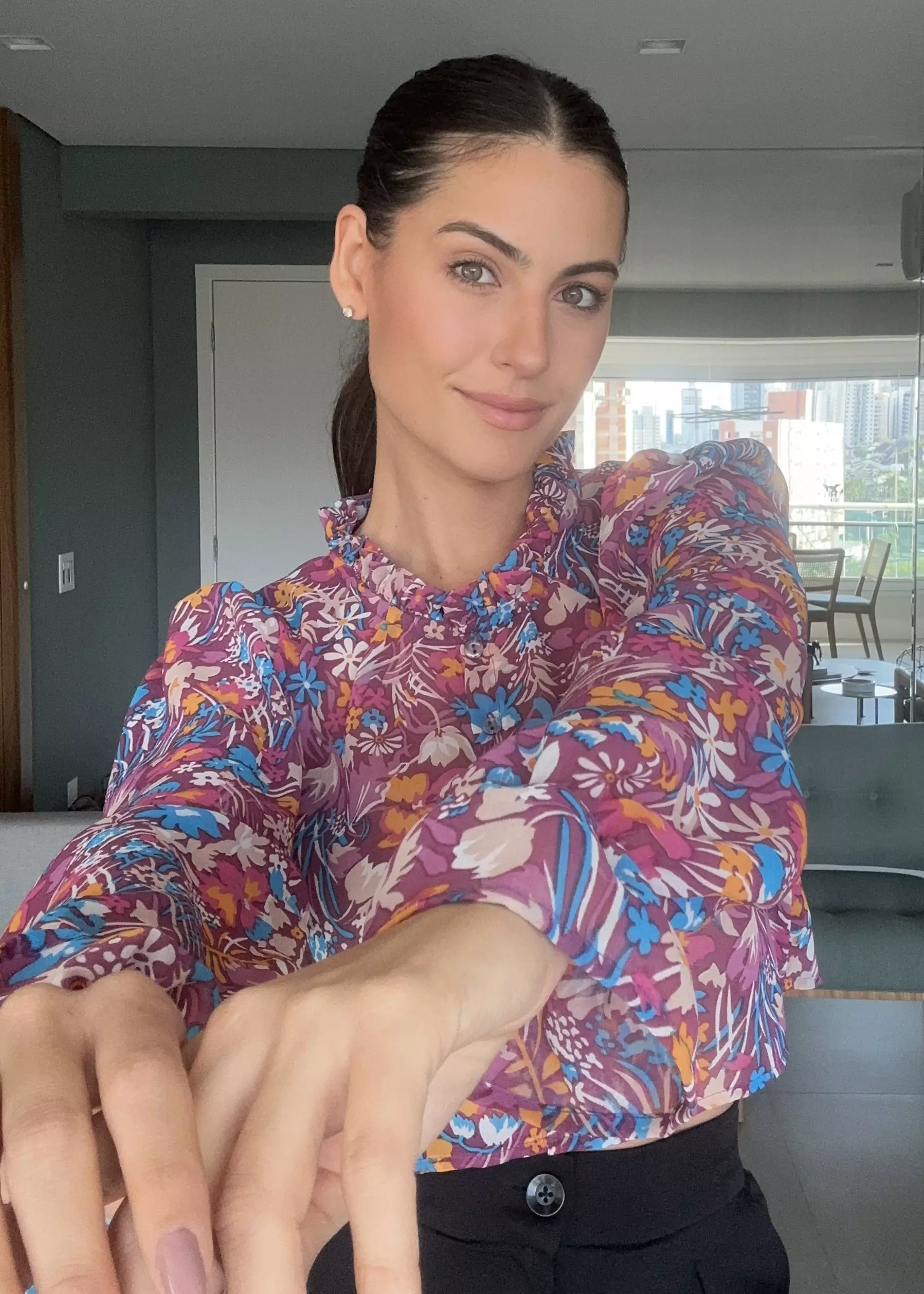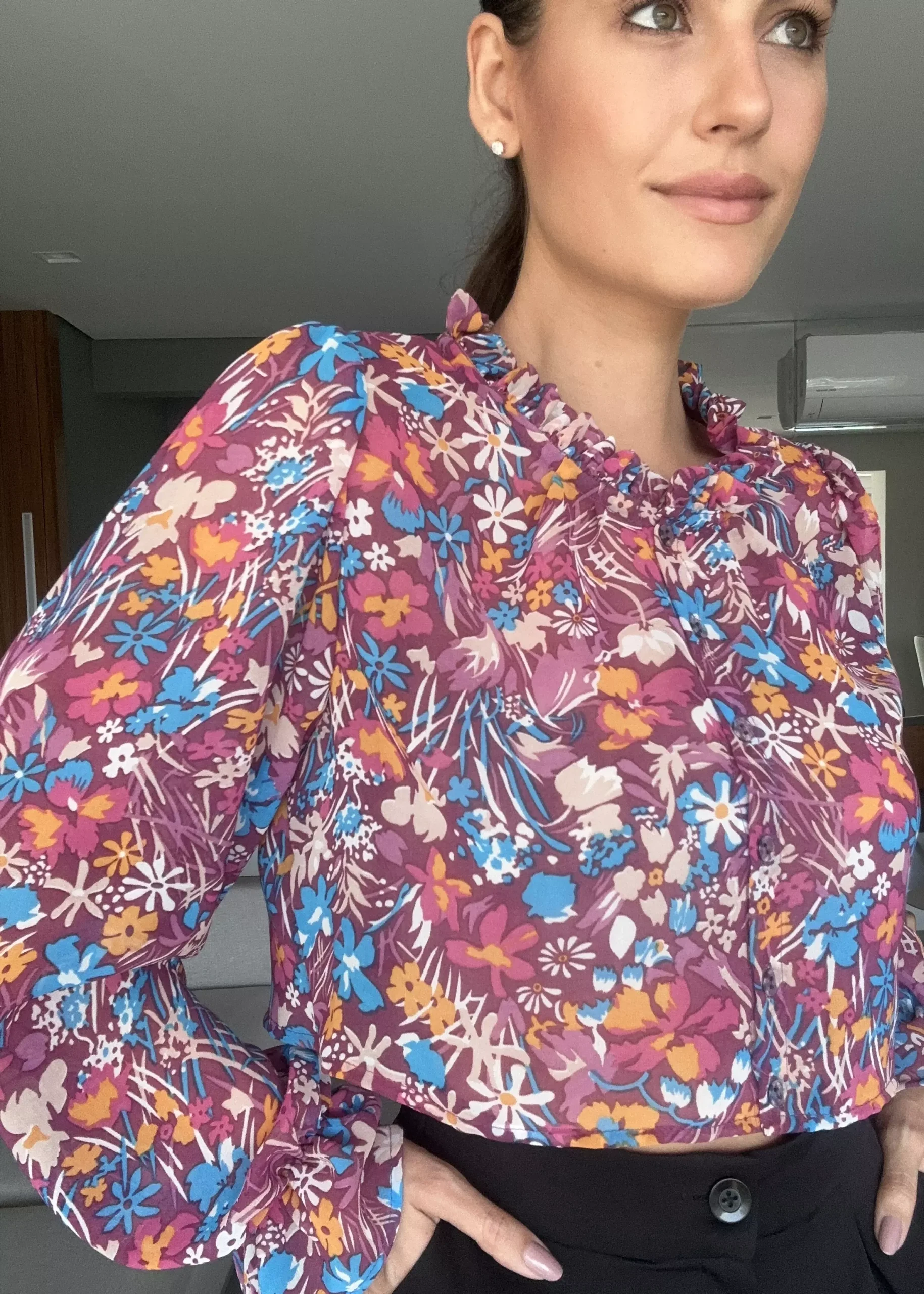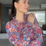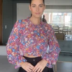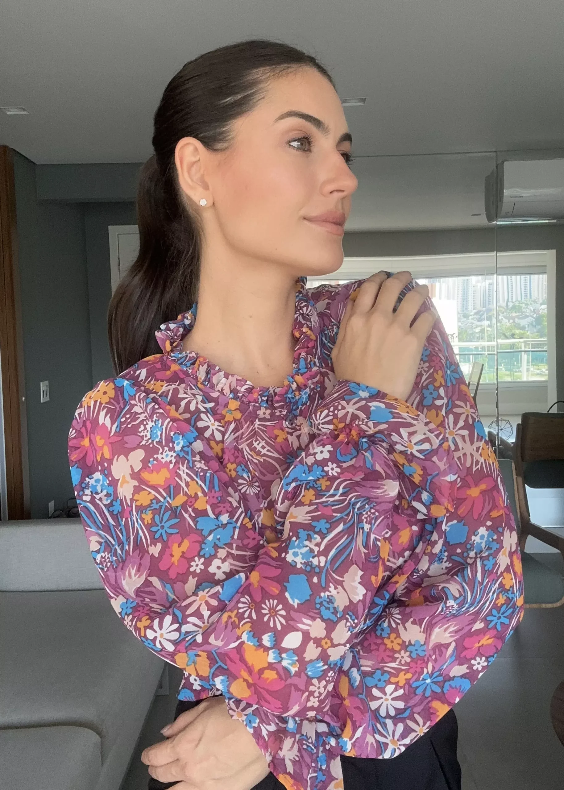CAMISA PALERMO CROPPED é confeccionada com tecido Musseline, de caimento leve e fluido e que não amassa com facilidade. Com elástico nos punhos e babado. Tem fechamento frontal de botões transparentes e uma gola babadinho. Drapeado nos ombros. Peça fluida e super feminina.