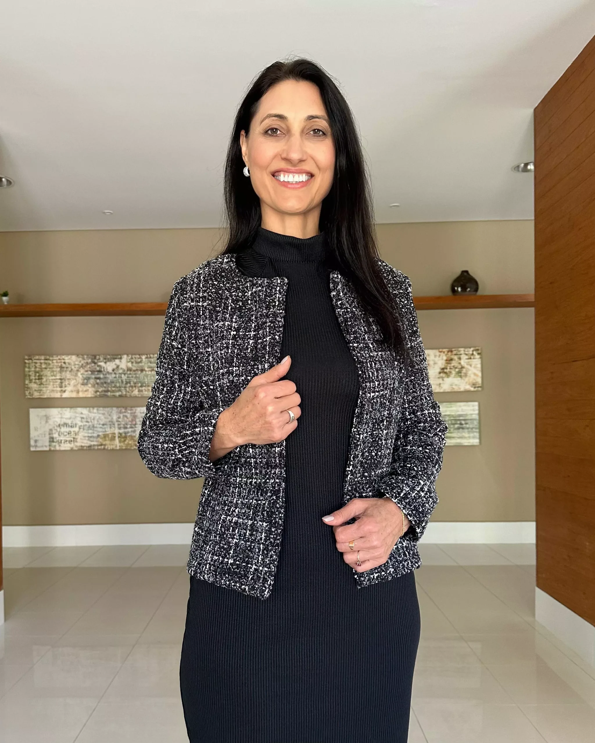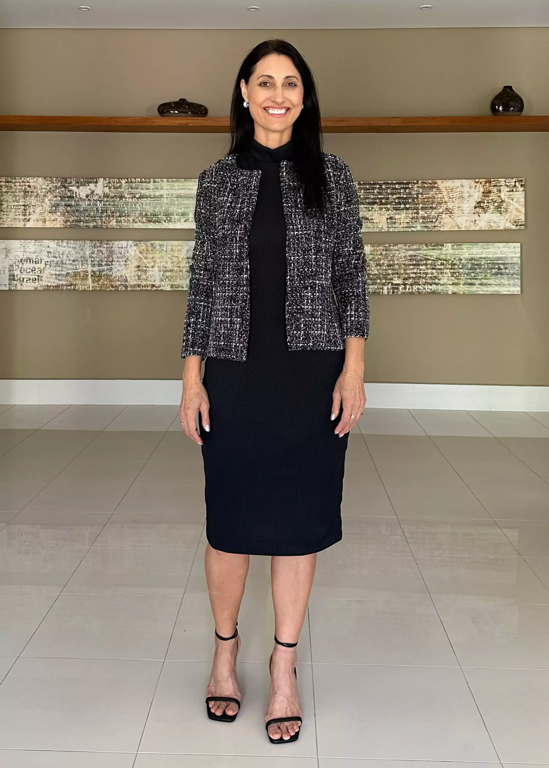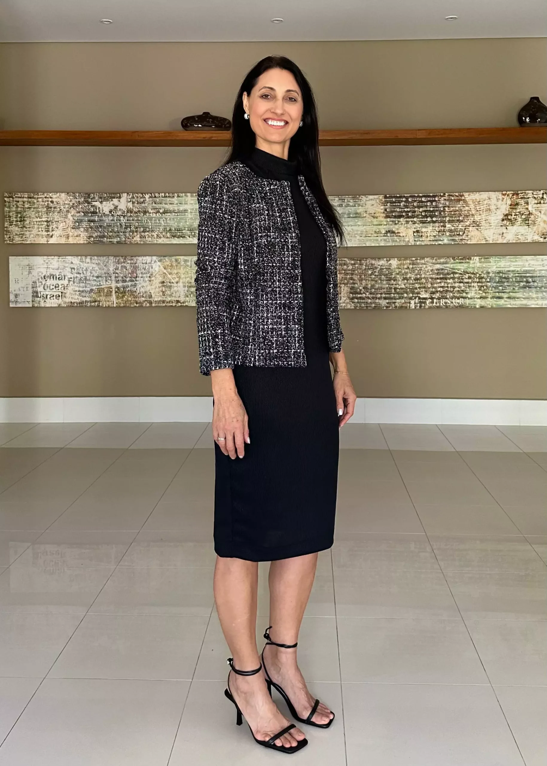 CASACO LISBOA preto mescla, estilo alfaiataria, confeccionado com tecido Tweed. Esse casaco é o bom e classico tweed, que deixa qualquer produção com um ar mais sofisticado. Esse tecido não amassa com facilidade. Com fechamento em botões e corrente na parte frontal. Uma terceira peça extremamente versátil.
