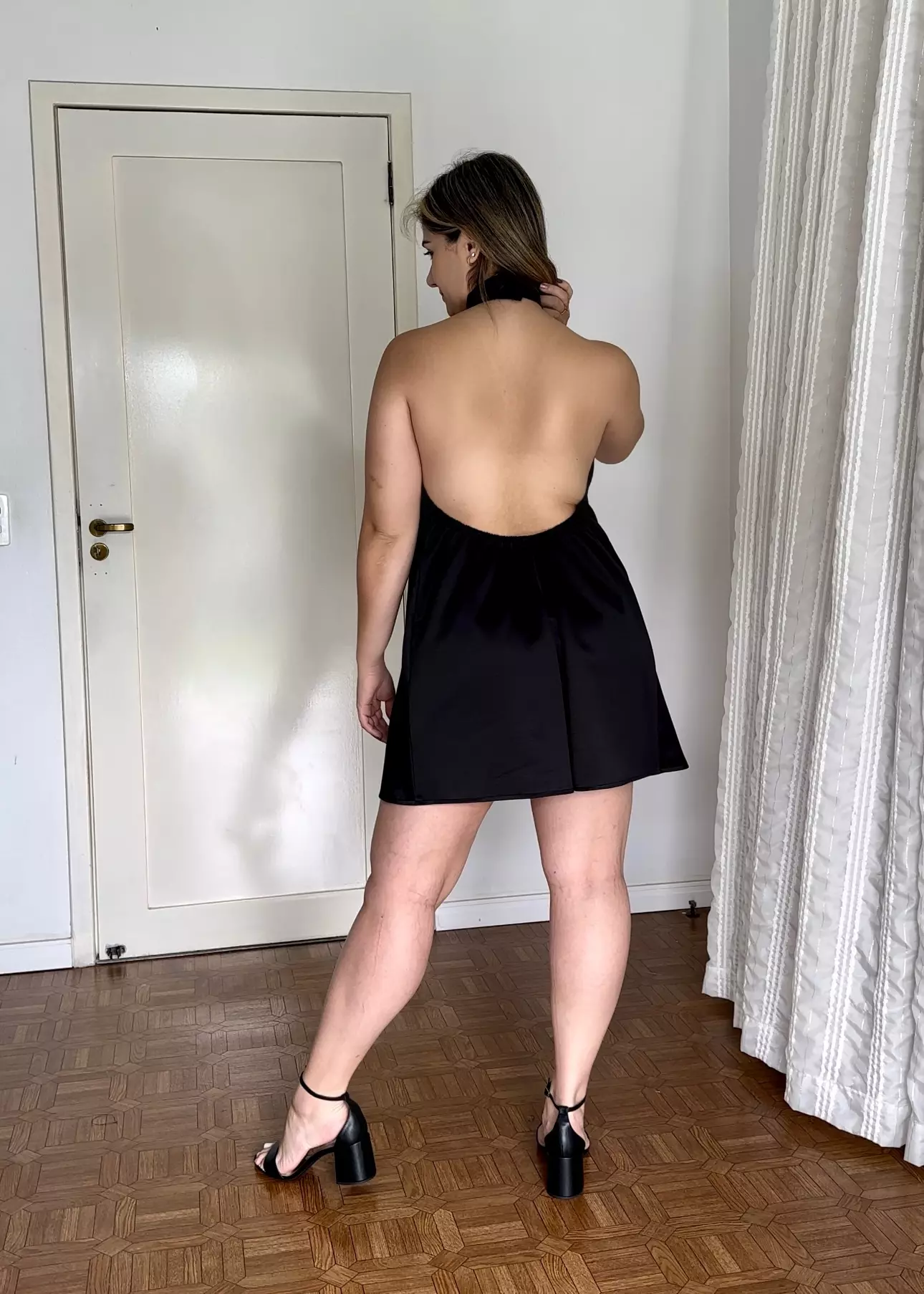 Vestido frente única preso no pescoço com botões forrados com o mesmo tecido do vestido. As costas abertas, com um drapeado na parte da cintura. Uma peça fácil para vestir, feminina e linda, um tecido de alta qualidade, conforto e sofisticação.