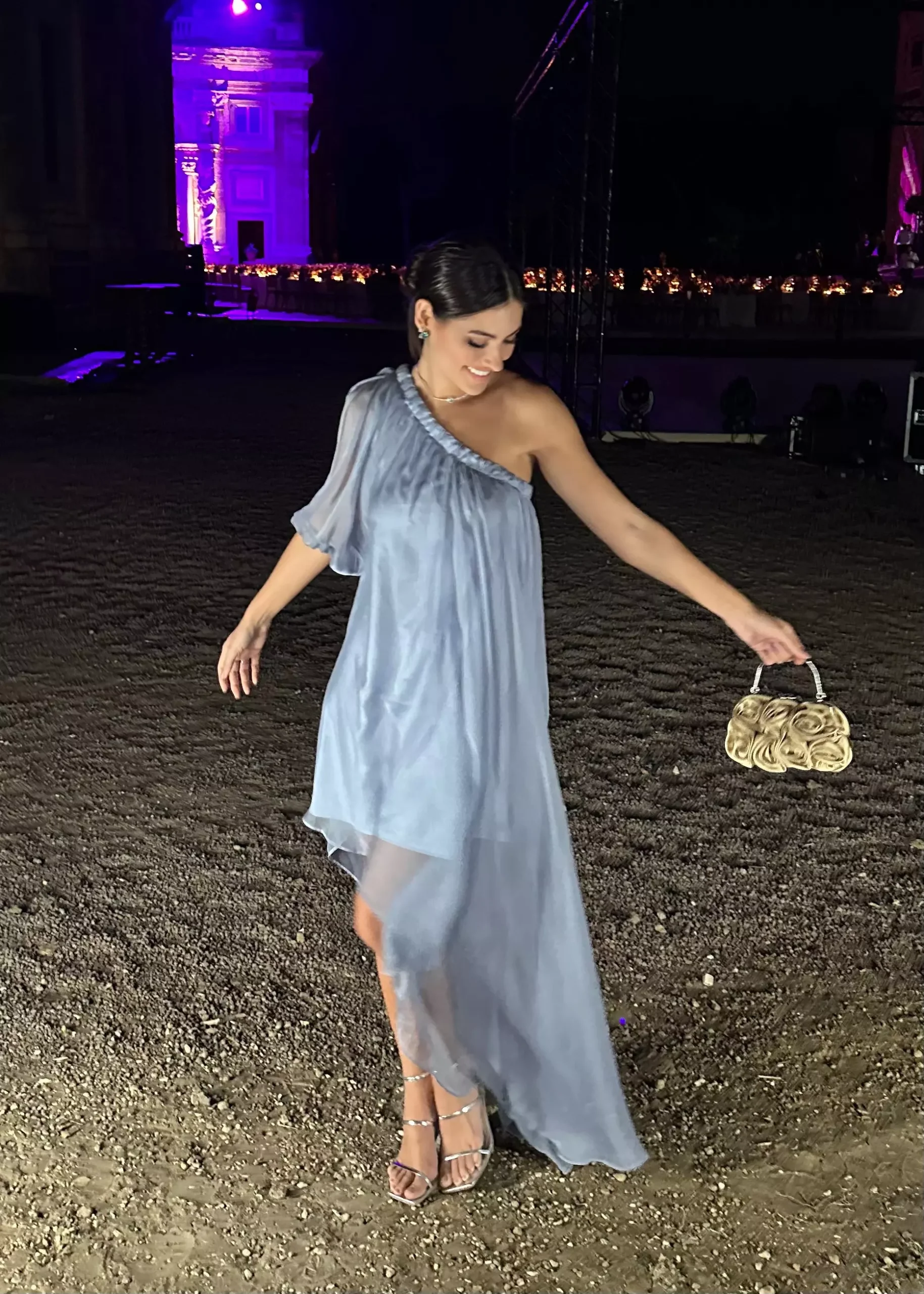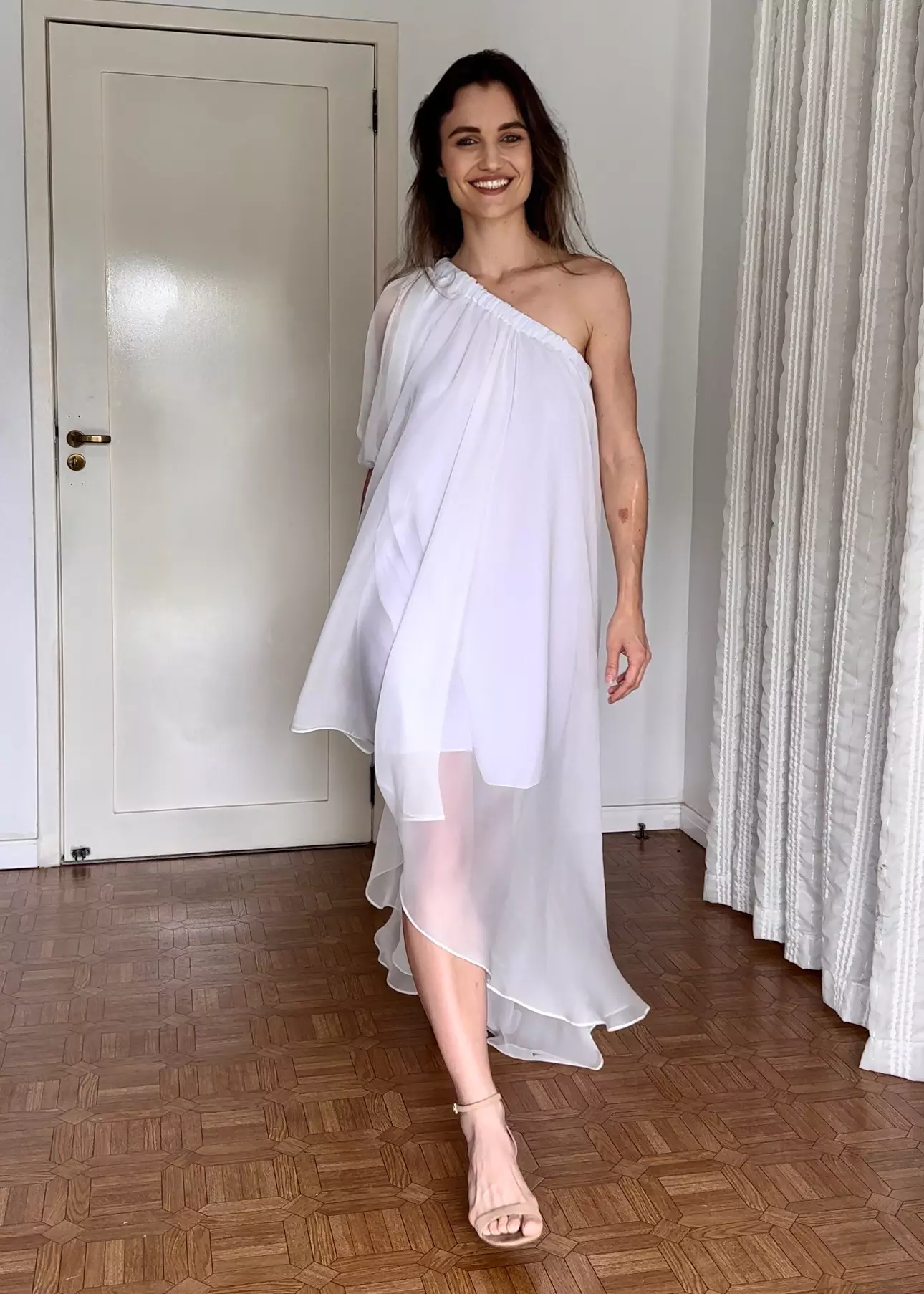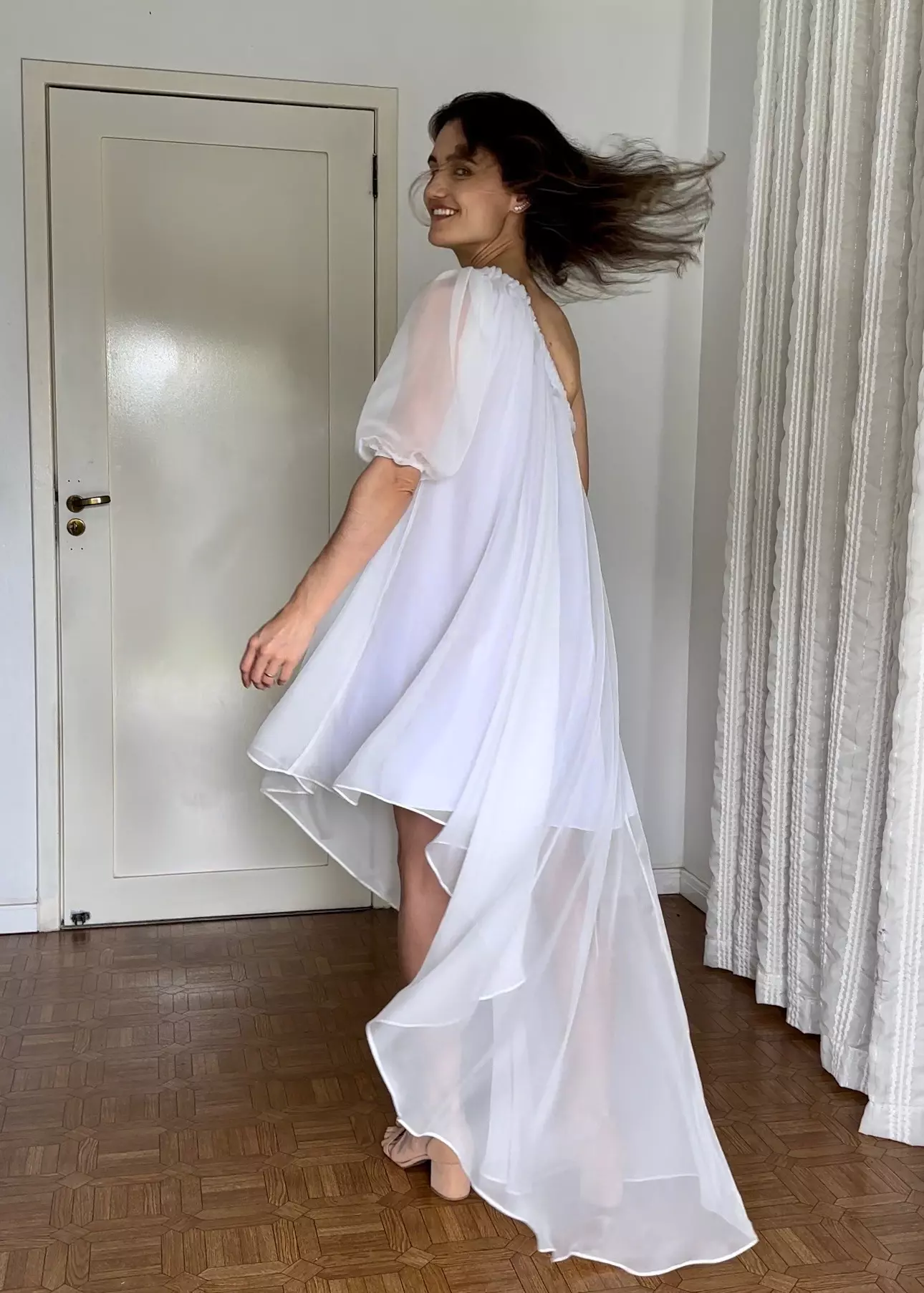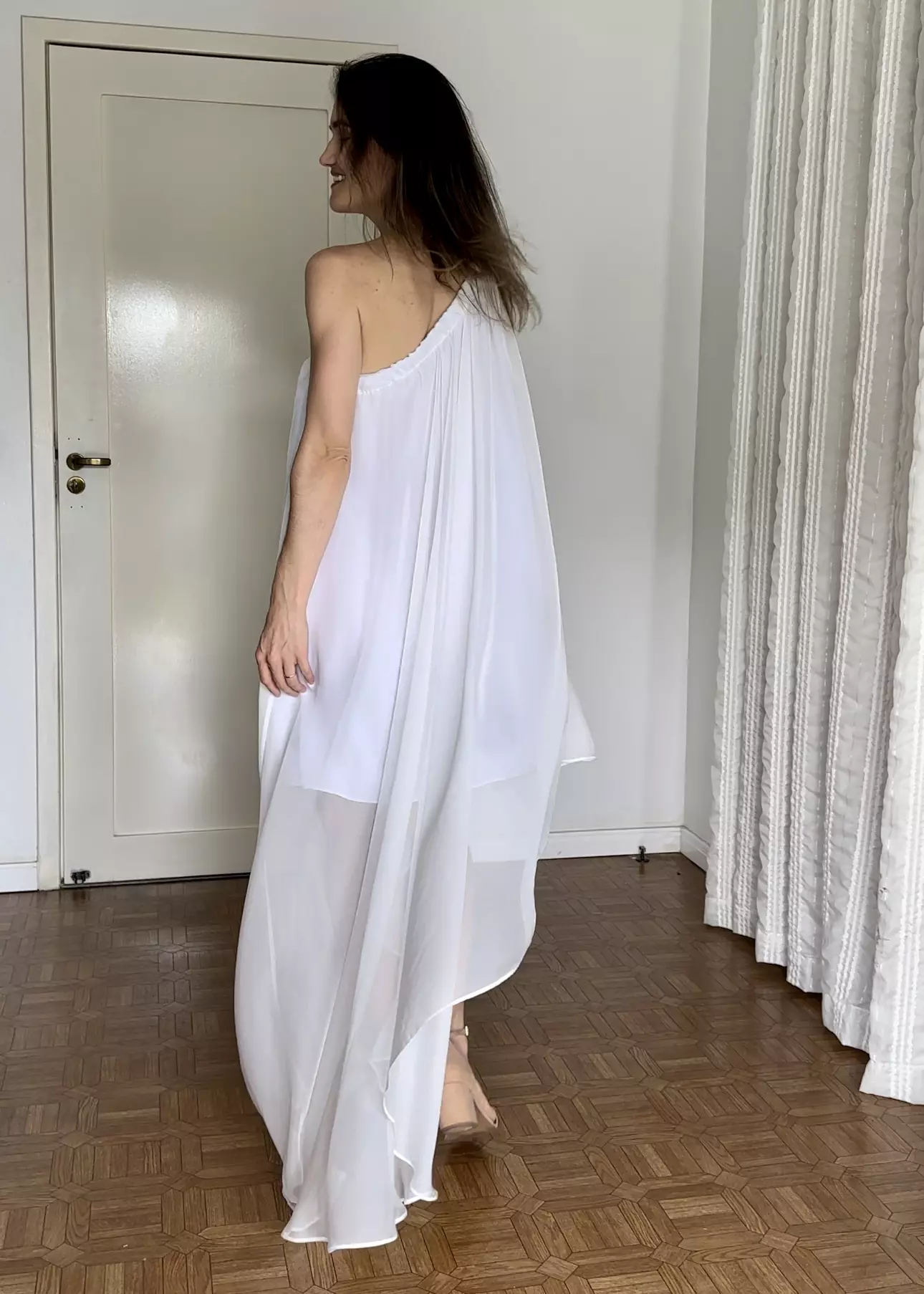 VESTIDO VENEZA é confeccionado em Gazar toque de seda, com transparência, toque macio e caimento muito fluido. Vestido assimétrico com manga bufante e elástico, de um ombro só, elástico na parte superior para maior sustentação. Design diferenciado por se tratar de um vestido curto, mas ao mesmo tempo logo, possibilitando assim ser usado em diversas ocasiões. Uma peça fácil para vestir, extremamente leve, elegante e feminina.